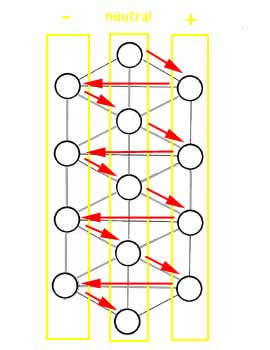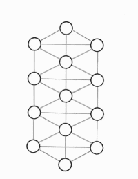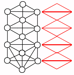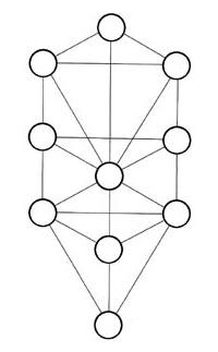 In regards to the spheres, a little comment: the level of subtle energy we are dealing with here is sometimes called etheric or ethereal. It is a subtle energy form that although invisible to our eyes, is nevertheless real, and can be perceived by those with psychic gifts. But it is now also being (re-)discovered by some scientists with interests into the old ether theories, and by those who talk about the so-called longitudinal scalar waves, the science of which is claimed to have been developed in secret by the military. This is not the place to go into this science or technology. You can look it up on the web. Back to the etheric pattern. The hexagonal pattern stretches out indefinitely as an all-encompassing web of energy. And the Tree of Life fits nicely on this pattern, and within the traditional Flower of Life within a circle. I am convinced that in esoteric circles where knowledge was transmitted by experience, the initiates were able to perceive the energy grid of the Flower of Life, and that the cabalists discovered, by actual visual experience, that part of it formed a Tree of Life in relation to the human body. For those who were not initiated, the Tree of Life just became book knowledge. One could argue that all this is just a mathematical coincidence, but I found the connection between the Tree of Life as formed by interlocking circles and by extension on the hexagonal grid and the flower of Life as an energy grid for a living being. It was a dowser who found that the Tree of Life is an actual energy template that relates to the physical human body. Joey Korn, a dowser, has an informative website at http://www.dowsers.com. You can find the whole story there, but I'll give you a summary. Previously he had found, by using L-rods, that humans had two lines of energy (or rays of light, as he calls them) that intersect and form at that intersection a vortex of energy. This is not a new concept as this is well known by dowsers of energy lines in nature. But with humans he believes that they anchor the soul to the body. Looking into it a bit further, he found that these intersecting lines were repeating themselves in a pattern. They also existed in people's bed, as an imprint of the person who sleeps in that bed. The energy of the 'bed pattern' always dosed positive. As he dowsed more he found that the lines always came in pairs like an X or a + form. In 1197 he came up with an initial pattern. He also found that with some people the 'bed pattern' wasn't always that strong, and sometimes some of the lines were missing. This would reflect the health situation of the person. The initial pattern was the result of dowsing the energies that were contained to the physical size of the bed. Later he found more lines that existed beyond the boundaries of the bed, but that also were part of the now more complex pattern. I want to point out here that originally he was looking within the confines of the physical dimension of the bed, and therefore the other lines didn't show up. It is well known that the drawback with dowsing is that one's results will reflect one's belief system about what one is dowsing. Having arrived at a certain pattern of the number of lines he had discovered so far, one day he picked up a book on Kabala and was surprised to find that the pattern he so far had found was the same as the Kabalistic Tree of Life minus a number of lines he had not dowsed yet. The next morning he dowsed again the 'bed pattern' and indeed he found the remaining pairs of energy lines. Now he had found the entire Tree of Life energy lines/pattern that is present in the energy field of every person, and by extension in their beds as an imprint. I contacted