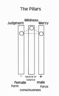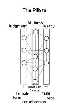 As we mentioned before, the sephiroth are emanations from the divine. They are strongly defined by number and place on the Tree of Life. But what are they? According to Israel Regardie they are considered "to be substantial principles of power-vessels, or categorical ideas in which the consciousness of the universe expresses itself". Sounds mind blowing, doesn't it? They are like vessels or channels, in which and through which the divine powers can manifest themselves in their creative evolution. They are spheres of light, receptacles that hold particular energies as they stream down from the divine source. They are like different potencies emanating from the divine. They are constantly there, always active, never ceasing. They are a medium between the divine, the Absolute (Ain-Soph) and the physical world as we know it. They are characterized by limitation, measure, and concretization. They are gradations of powers, that is why they have different places on the Tree of Life. They are the substance of reality. They emanated from the divine, but are uncreated. The created universe that followed is just a reflection. The question arises, how did they come into being? Therefore we have to have a look at the Beginning. First there is Ain. Ain is Negativity, Nothingness, The Negative Existence, the Great Emptiness, The Absolute, The Absence of Things, The Prime Cause, The Originless Origin of all manifestation. You guessed it; it is not knowable, it is indescribable, everything we say about it, it is not. Then there is Ain Soph. Ain means 'not' and soph means "end". Ain Soph is the Infinite, The Limitless, Infinite Space, Eternity. It is also called the Holy Old One, or the Old One of All Old Ones. Ain Soph is the primal darkness of the absolute unity above anything else. Ain Soph is the one in which everything has its origin, its existence, and to which everything returns. Next we have the Ain Soph Aur. Aur means light. The Ain Soph Aur is the Limitless or Infinite Light. Now the Ain Soph Aur retracts itself within itself to a light point. Here we have substantiality out of nothing. This brings forth Kether (=the Crown), the first Sephira at the top of Tree of Life. Here is the primal vibration of the universe to follow. This light point starts to emit light energy, light rays. This is the primal ocean of subtle ether used for the building of the universe. This subtle ether is polarized into harmonious moving opposites of positive and negative, attraction and repulsion, contraction and expansion. There is harmonious equilibrium. The negative energy creates the Severity (Judgment) pillar on the left side and the positive energy creates the Mercy pillar on the right side of the Tree of Life. And thus the next two Sephiroth arise: Chokmah (Wisdom) on the right side, and Binah (Understanding) on the left side. The left pillar is also called the Pillar of Form, the right pillar the Pillar of Force, and the middle pillar, the Pillar of Consciousness. Of the middle pillar it is said that it both shows how God reveals Himself to us (downward movement) and how it is our path for "conforming to His image" (upward movement). Ok, now we have three Sephiroth, and they form a trinity, called the Supernal triad. Under this trinity is the Abyss. Above the Abyss is the realm of ideas, or the Ideal. Under the Abyss, is the world of the real, or Reality and Causality, in which the next seven Sephiroth are to come. The next seven Sephiroth are the crystallization, the densification, of the subtle ether. Together they produce the universe, the world we know. To the right are all ten Sephiroth of the Tree of life with the columns superimposed. I am using here the traditional names of the Sephiroth. Their names don't always reflect the meaning or content of them. It is not clear why the ancient kabbalists choose those titles. To know what the Sephiroth are about, one needs to read the explanation of each Sephirah. Kether is the first manifested Sephirah, the first condensation of the light of Ain-Soph. Kether means 'the Crown'. It sits like a crown on the top of the Tree of Life, but at the same time is the Crown on top of our head. It is said that Kether encircles and covers the brain of the primordial Man, Adam Kadmon. One might compare it with the Crown Chakra of the yoga system. It is called the Crown because Kether belongs half to the human system (and the Tree of Life) and half to the Divine (or Ain-Soph), like a crown sits on top of the head, but is not quite part of the head itself. Kether connects the Divine and the human. Or, man lives in the universe but does not belong to the universe, but to the divine. Kether is man's connection to the divine. That is why Kether is partly hidden, because of its connection to the Nothingness, and partly manifest because of its connection to the manifested universe. Kether is the source of light rising up from the darkness. It is a monad of pure energy in which all opposites are unified. In Kether is the blueprint of the entire universe. Kether is also called Mashabah, which is consciousness, as Kether is pure consciousness. In Kether resides the divine essence of a person, indestructible. Kether is also called the Crown because of its ability to receive and integrate the divine energy. For me, Kether means the very essence of my being, that divine monad that always has been and always will be. It is immortal, as it is part of the Divine, separated only in my present awareness. Being in Kether I truly can say, "I am the Divine". Kether also represents my birth in this world and all the qualities I have been born with. Chochmah is the second Sephiroth. Chochmah means 'wisdom'. It is the Word, the Logos. It is the Son in relation to Kether as its Father. Remember Chochmah is on top of the right, positive, male pillar, and thus Chochmah is considered to embody the primal male energies. It is the active, male principle, the vital, energizing element of existence. In Chochm