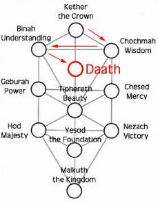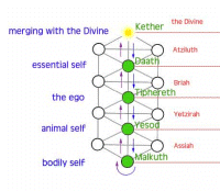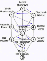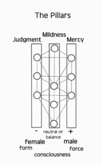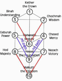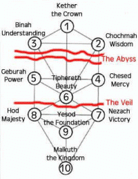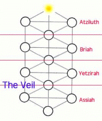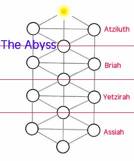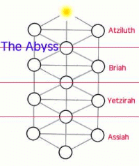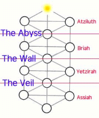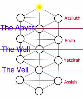Pillar When we go down the Tree (on the middle pillar of consciousness), on the path of emanation and creation, we first have Kether, where the divine monad is (what we all are in essence) in unity with the Divine. Then we have Daath where the monad gets knowledge of itself as a separate unity. It is aware of the unity of opposites in the world of Atziluth, including the consciousness of being the opposites of 'me and the Divine'. But this divine essence, which has a sense of "I", looks downwards and wants to create. Not only is the next world, Briah created, but it creates itself the sense of an ego, of being an individual, reflected in Tiphereth. Now it sees itself as the center of the universe, and of the Tree of Life. Again it wants to express itself even more, and creates the world of Yetzirah, and an animal self in order to experience form and procreation. This happens in Yesod. Finally it builds itself a physical body in the physical world, the ultimate downwards transformation of itself in its most crystallized form. In Malkuth is the transformation of becoming. It is the transformation of coming down here in the physical world by birth, growing up, learning, developing consciousness. In Malkuth one becomes more than just a body. Then it is time to go up the Tree, the mystical path of transformation. The first transformation happens in Yesod. It is a basic requirement in all initiatory rites, the first thing to happen is the transformation of the animal self, not by suppression, but becoming aware of the 'lower' emotions of passions, desires and sexuality. Then one should learn not to be dominated by these emotions, but to dominate them, to rise above them, to use them when necessary, and to transform the rest of their energies into higher energies. Otherwise one will be bound by animal energies and get nowhere. It is not for nothing that we call people who act primarily from their lower energies 'animals'. But we should not forget that we all have those animal energies in ourselves. And that it is what makes us survive in the physical world. Having 'killed' the 'beast' or 'dragon' in ourselves we can truly be called human. Here we are in Tiphereth, and act with higher emotional energies. The emotions and feelings are more refined. In Tiphereth is the sense of ego, and this is the next transformation that needs to happen. The ego is a construct and tries to maintain its existence by reinforcing "I-Me-Mine". The ego is a necessary value to express ourselves but it keeps us separated from others. It is when we open up to other people, to other living beings on the planet, to nature, to the energies around us, to the entire universe, that a profound transformation happens. The sense of ego diminishes and one finds oneself as a part of a complex world of beings, like and unlike oneself. Here a person starts to feel that he is one with the universe. Sacrifice of the ego is traditionally symbolized by the crucifixion, which is one of the symbols of Tiphereth. The next transformation happens in Daath when one enters the world of Atziluth. In Daath one not only gains knowledge of his divine self, but one becomes his divine essence. Actually he always has been, but now he has become aware of it again. In Daath he transcends the strong sense of duality that still pervaded his being in the world of Briah, and now he knows the duality is only a perception. Now he sees duality in unity. In Daath he enters into unity. Although there is still a sense of duality between "I" and the Divine, he is in unity with the divine energies and everything that exists. This is a profound transformation called in yoga terms the transformation into the diamond body, it is the realization of the "true essence" of man. The last transformation happens in Kether where one enters the Divine, not to return anymore. Also note that coming down the Tree of Life, be it via the middle pillar, or via the way of the Shekinah (through the successive Sephiroth), it is a process of continuing contraction. Ascending the Tree is a process of continuing expansion. The Boundaries of the Four Worlds A word here on the Veil and the Abyss. Information is not available about them. There is not really a veil or an abyss, they are symbols for a transformation, a leap in consciousness, or a leap into another world. There should also be a third boundary that I have called the Wall. I will explain here why there is a third one, why they are all situated on the boundaries between the four Worlds. The Veil Different kabbalists place the Veil on different places, sometimes underneath Tiphereth, sometimes just above or below Yesod. They don't seem to know just where to put it. What actually is the meaning of those two terms? They are boundaries. A veil or curtain is often used in initiations. Once one has passed the veil or curtain one has stepped into another, hidden world. Like the Veil behind the High priestess in the Tarot. The Abyss has the same meaning. Crossing the Abyss means that one has stepped into another realm. A veil or curtain is made out of cloth, and cloth is the most natural, man-made thing used to cover things up. The genitals (Yesod) is the first area of the body that is covered up with a piece of cloth. It is my opinion that the Veil on the Tree of Life is situated at the boundary of the world of Assiah and the world of Yetzirah. That is in complete accordance with the traditional meaning of initiating a novice. One leaves the mundane world aside and steps for the first time into the inner realms of the human psyche which lie just beyond the physical. It is called the Veil because a veil covers up something. Lifting a veil or a curtain is like stepping in another room. The Abyss The Abyss traditionally is situated underneath Chochmah and Binah, and it is said that Daath lies across it. This corresponds with the boundary of the world of Briah and the world of Atziluth. This boundary is called the Abyss because the transfor