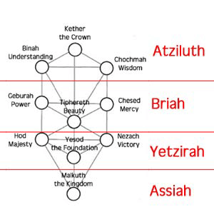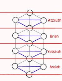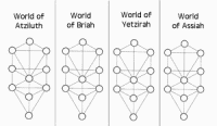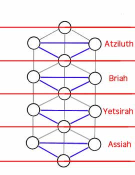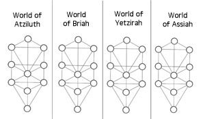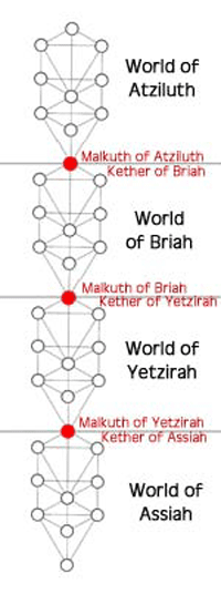 The Tree of Life and the Four Worlds The Four Worlds relate to the Tree of Life in different ways. They are all equally valid and the different system are just different ways to look at the same thing, like a diamond that shows different colors under different angles of view. One way to look at it is by saying that the Tree of Life exists in each World, thus we have four Trees, an Atziluth tree, a Briah tree... Thus we have, for example, a Tipheret Sephirah in each of the four worlds, each having different qualities according to the World it is in. Another way is that the ends of the Tree of life overlap when crossing a World. Malkuth of Atziluth becomes Kether of Briah; Malkuth of Briah becomes Kether of Yetzirah; and Malkuth of Yetzirah becomes Kether of Assiah.