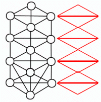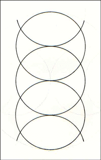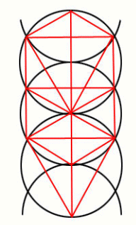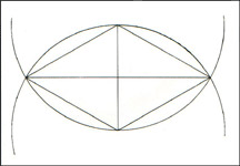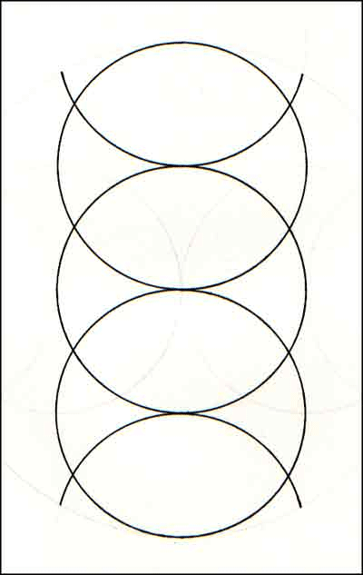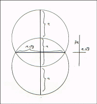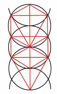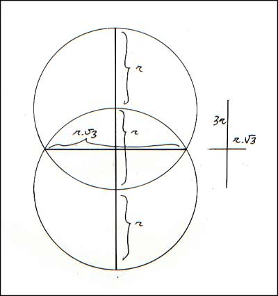 When we call the radius of the circle r, then the following mathematical expressions appear: Besides the point and the circle, the third geometric structure is the line. And there are three lines of different length. The radius of the circle is r (the vertical axis of the diamond). The distance of the center point of the 'ellipse' or diamond to the circle is r/2. The distance of the same center point to the point where the the two circles cross is (r/2)X√3 (radius divided by two and multiplied by the square root of 3). √3 is the first square root to appear. When measuring the simple distance of the above we obtain (r/2)X√3, or the total length of the long axis of the diamond is rX√3. But when we calculate the relation of the long axis of the diamond to the short axis of the diamond (the cross), we obtain the pure square root of three: rX√3/r = √3. When we duplicate the circle three more times, we obtain the thirteen points on the circles of which actually ten are attributed to the Sephiroth (sometimes one more for Daath, the 'hidden' Sephiroth). One wonders why they left out the two lower ones. Then I asked myself why was the structure drawn in three complete circles with two half circles (top and bottom). It seemed to be part of something else. Let's leave the mathematical expressions behind and return to the two circles: