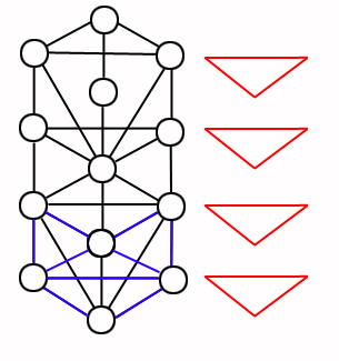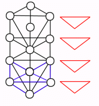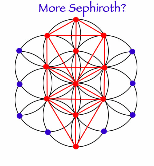 fits perfectly in here: Are there more hidden Sephiroth? we will go into this in the following chapters. When I am studying esoteric systems, I always ask why things are the way they presented. I question even established doctrines. When you take everything for granted, you often miss the point. The following flowed forth naturally when I studied the Tree of Life, because not only are there differences between kabbalists on certain issues, but also certain explanations don't seem to make sense, at least to me. I think the traditional Tree of Life is incomplete because there are Sephiroth and paths missing, which when added makes all the other things come into place. In the following I will explain why I feel the need for a corrected Tree of Life and why I think this is a better representation of the whole system, without invalidating the traditional Tree of Life. It is all about symmetry and geometry. First a little word about the paths: The traditional paths are not that logical to me. Why are Binah and Chohmah connected with Tiphereth, and Hod and Nezach with Malkuth, but Chesed and Geburah are not connected with Yesod? Also, and more important, one Sephiroth flows forth from another in a well defined order when going down the Tree. First we have Kether, then Chochmah, then Binah, then Chesed and so on. Although Chesed flows forth from Binah the Tree of Life (as shown by the kabbalists) never shows a path between those two Sephirah. Because Chesed flows forth from Binah there must be a path. Even when Daath is taken into consideration there must be a path between Binah and Daath and between Daath and Chesed. Let's start with what is to me the prime question: the missing Sephiroth. First and for all, Daath should be included in the Tree of Life. The cabbalists always stress that the Sephiroth work in pairs (one each on the + and - pillar) producing a third one on the middle pillar that represents the equilibrium of its two 'parent' Sephiroth. When Daath is mentioned it is the 'child' of Chochmah and Binah. Tiphereth is the result of Chesed and Geburah, Yesod is the result of Hod and Netzah. But what is Malkuth the child of? In the traditional Tree of Life, it kind of dangles at the end of the Tree, not being the result of polar opposites. If there is a place in the universe where polar opposites play a prominent role, it is the physical world. Malkuth, like Yesod, Tiphereth and Daath must be the result of two 'parent' Sephiroth, and there is indeed a place for them. In Nature we find symmetry everywhere. Symmetry creates balance and harmony. The original person who came up with the Tree of Life might not have seen the entire picture. In my opinion the traditional Tree of Life does not feel harmonious, complete nor coherent. As we will progress further into our study we will see that the underlying structure is completely symmetrical. So for now we draw the Tree of Life as a symmetrical structure. In regards to the triads. Traditionally a triad is explained as the balancing of two Sephiroth into a lower third one. Thus a triad is a downward pointing triangle. I think that one can equally say that the balancing goes both upward and downwards. Basically the middle pillar is balanced by the left and right pillar. By extension, the entire tree (in its complete symmetrical form) balances itself in all directions, because everything is symmetrical. It is one thing to change the traditional Tree of Life, but how does this impact the other kabbalistic doctrines related to the Tree? With the traditional Tree of Life different kabbalists place certain subjects on the Tree in different ways, without any explanation as to why they do so. For example, the Veil is sometimes placed under Yesod, sometimes above; or the four Worlds are divided differently over the Tree. With the new Tree of Life I will explain why this system allows for a more coherent and meaningful assignment of these issues to the Tree. First, we have to keep in mind that although Kether is depicted as a Sephirah like all the others, it is actually a direct emanation from the Divine, a Crown that sits upon the Tree of life, as a crown sits on the head of a man, sometimes it is considered a point of light. The Sephiroth When numbering the Sephiroth, Daath gets included, as well as two new Sephiroth above Malkuth. In my opinion, the two new Sephiroth are energy centers that could equal Instincts and Desire, as they are above the physical body but below the realm of Yesod, that among other things is associated with sexual energies. We still have the same three pillars, positive, negative and neutral, each containing four Sephiroth. In the process of emanation and creation, there is the same flow of energy going down the Tree. Every time when the Shekinah rests, a Sephirah is created. When the Shekinah rises, or when one's consciousness is expanding and rising up the Tree, the reverse path is taken. The flow of energy is all regular, no big leap from Binah to Chockmah, or a sudden vertical fall from Yesod to Malkuth. This is a much more regular, symmetrical, balanced flow of energy than in the traditional Tree of Life. With the New tree of Life, the four Worlds each contain a triad of Sephiroth. Each triad is formed of two opposite Sephiroth with a resulting equilibrium, a third Sephirah on the middle pillar. We have four Sephirah on each of the tree pillars. The Sephiroth on the middle pillar also acts as a transformation station between two worlds, except for Malkuth where the creation process stops. (Later we will see that the Sephiroth on the middle pillar are places for transformation of consciousness.) This is similar to the philosophy of the chakras. Chakras are also transformation stations where energy is transformed from one level into another. With this new Tree of Life we have a real dynamic flow of divine energy throughout the Tree. We have already shown that each world is equally divided over the Tree, and each world has a tr