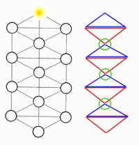 5. The Tree of Life and the Flower of Life Starting from the traditional representation of the Tree of Life I have explored some possibilities of looking at it in a wider perspective, in a more symmetrical form. Nature likes symmetry, from an apple or flower to the quantum world of sub-atomic particles. I have always wondered why the Kabalistic tree of Life was such a strange structure. At certain places in the tree it displayed symmetry, but then this symmetry was broken at other places. It is claimed that there are only ten Sephiroth because somebody in the distant past wrote this in his book. The tradition of enumerating 10 Sephiroth is stated in the Sefer Yetzirah, "Ten Sephiroth of nothingness, ten and not nine, ten and not eleven". But where did the writer get this from? The problem with written teachings is that they easily turn into dogmas. For this reason certain traditions would pass their knowledge on solely in an oral way. The knowledge had to be experienced, and not just accepted because somebody told them so. What I see in Kabala is that some people take the information as an unmovable, and unchangeable truth. In my previous articles I have shown that one can change the Tree of Life in a more coherent, symmetrical form, and still keep the traditional teachings. It was once thought that there were only seven planets (moon and sun included). If science had stuck to that idea, because at one time somebody wrote that there were only seven planets, not one more, nor one less, we would have never discovered the outer planets. Why did the people who originally wrote down the structure and information of the Tree of Life, structure it in such a unique form? Throughout history the Tree of Life has been interpreted in different ways, for example, by taking out or in Kether and Daath. However they kept it in its basic structure; although there was one representation (by Isaac Luria (1534 – July 25, 1572)) that depicts the Sephiroth metaphorically as successively smaller concentric circles, radiating inwards from the surrounding Divine Omnipresence. Concentric representations of for example different worlds are common among religious or esoteric groups.