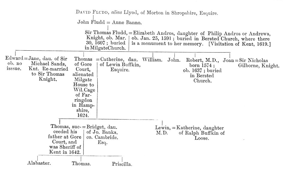 CHAPTER XI. ROSICRUCIAN APOLOGISTS: ROBERT FLUDD. THE central figure of Rosicrucian literature, towering as an intellectual giant above the crowd of souffleurs, theosophists, and charlatanic professors of the magnum opus, who, directly or otherwise, were connected with the mysterious Brotherhood, is Robertus de Fluctibus, the great English mystical philosopher of the seventeenth century, a man of immense erudition, of exalted mind, and, to judge by his writings, of extreme personal sanctity. Ennemoser describes him as one of the most distinguished disciples of Paracelsus, but refuses to number him with "those consecrated theosophists who draw all wisdom from the fountain of eternal light." He does not state his reasons for this depreciatory judgment, and the brief and inadequate notice which he gives of Fludd's system displays such a cursory acquaintance with the works in which it is developed, that it is doubtful whether he had taken pains to understand his author. I should rank the Kentish mystic second to none among the disciples of the "divine" Theophrastus, while in the profundity and extent of his learning, there can be no question that he far surpassed his master, who is said to have known little but to have divined almost everything, and who is, therefore, called divinus, in the narrower sense of that now much abused term. Robert Fludd was born at Milgate House, [1] in the parish of Bersted, Kent, during the year 1574. By his mother's side he was descended from the ancient family of Andros of Taunton in Somerset. His father, Thomas Fludd, was a representative of a Shropshire stock, and successively occupied several high positions. He was victualler of Bewick, and then of Newhaven in France; afterwards he was made Receiver of Kent, Sussex, and Surrey, and being appointed treasurer of the army sent under Lord Willoughby to Henry IV. of France, "he behaved so honourably that he was knighted, and on his return to England was made treasurer of all her Majesty's forces in the Low Countries." [2] This was in the reign of Queen Elizabeth; he was constantly a justice of the peace where he resided, and was also treasurer of the Cinque ports. "He bore for his arms--vert, a chevron between three wolves heads erased, argent, which coat, with his quarterings, was confirmed to him by Robert Cook, Clar., Nov. 10, 1572." [3] I have succeeded in compiling from various sources the following scanty genealogy of the Fludd family:-- Robert Flood Genealogical Tree According to this genealogy, Robert Fludd was the youngest of five sons. He was entered of St John's College in the year 1591, at the age of seventeen. Having graduated both in arts and medicine, he appears to have travelled extensively, for the space of six years, in France, Germany, Italy, and Spain. On his return to England, he was made a member of the London College of Physicians, and took his degree of Master in Arts in the year 1605. His first published work appeared in 1616, about which time he was visited by Michael Maier, by whom he was probably acquainted with the Rosicrucian controversy, and with whom he corresponded after the renowned German alchemist had returned to his own country. Fludd appears to have resided chiefly in London, then as now the great intellectual centre of England. He had a house in Fenchurch Street, according to Fuller, [4] and another in Coleman Street, where he died in the year 1637, on the 8th day of September. He was buried in the chancel of Bersted Church, under a tomb which he had previously erected--"An oblong square of dark, slate-coloured marble, occupying a large space of the chancel wall on the left as you stand before the altar, looking up the body of the small church towards the door. There is a seated half-length figure of Fludd, with his hand on a book, as if just raising his head from reading to look at you. Upon the monument are two marble books inscribed Misterium Cabalisticum and Philosophia Sacra. There were originally eight books. The inscription to his memory is as follows:-- "'VIII. Die Mensis VII. Ao Dm, M.D.C.XXXVII. O doribus vrua vaporat crypta tegit cineres nec speciosa tvos ovod mortale minvs tibi. Te committimus vnvm ingenii vivent hic monumenta tui nam tibi qui similis scribit moriturque sepulchrum pro tota eternum posteritate facit. Hoc monumentum Thomas Flood Gore Court in oram apud Cantianos armiger infoelissimam in charissimi patrin sui memoriam nexit, die Mensis Augusti M.D.C.XXXVII.'" [5] Bersted Church is situated on high ground, at a small distance south of Bersted Green. It is dedicated to the Holy Cross, and, according to Hasted, [6] is a handsome building, consisting of two aisles and two chancels, with a square beacon tower at the west end of it. This is in the Perpendicular style, and at three angles of the summit are three rude figures, said to be three dogs or bears seiant, but so defaced by time that they cannot well be distinguished. The list of Fludd's works is as follows:--