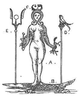 Fig. 23 'The personation of a dog--their invariable accompaniment, as it is also found amongst the sculptures of Persepolis, and in other places in the East--would in itself be sufficient to fix the heathen appropriation of these crosses' (the ancient Irish crosses), 'as that animal can have no possible relation to Christianity; whereas, by the Tuath-de-danaans, it was accounted sacred, and its maintenance enjoined by the ordinances of the state, as it is still in the Zend books, which remain after Zoroaster.'--O’Brien’s Round Towers of Ireland, 1834, p. 359. 'I apprehend the word "Sin" came to mean Lion when the Lion was the emblem of the Sun at his summer solstice, when he was in his glory, and the Bull and the "Man" were the signs of the Sun at the Equinoxes, and the Eagle at the winter solstice.'--Anacalypsis, vol. ii. p. 292. Figure 23 is an Egyptian bas-relief, of which the explanation is the following: A is the Egyptian Eve trampling the Dragon (the goddess Neith, or Minerva); B, a Crocodile; C, Gorgon's head; D, Hawk (wisdom); E, feathers (soul). 'The first and strongest conviction which will flash on the mind of every ripe antiquary, whilst surveying the long series of Mexican and Toltecan monuments preserved in these various works, is the similarity which the ancient monuments of New Spain bear to the monumental records of Ancient Egypt. Whilst surveying them, the glance falls with familiar recognition on similar graduated pyramids, on similar marks of the same primeval Ophite worship, on vestiges of the same Triune and Solar Deity, on planispheres and temples, on idols and sculptures, some of rude and some of finished workmanship, often presenting the most striking affinities with the Egyptian.'--Stephens and Catherwood's Incidents of Travel, in Central America.