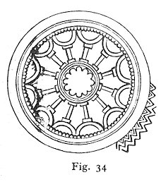 Fig. 34 In the 'tables' (Tablier, Fr. = Apron), alternating with tying-knots, of the Order of the Garter--which 'Most Noble Order' was originally dedicated, be it remembered, to the Blessed Lady, or to the Virgin Mary--the microcosmical, miniature 'King Arthur’s Round Table' becomes the individual female discus, or organ, waxing and waning, negative or in flower, positive or natural, alternately red and white, as the Rose of the World: Rosamond, Rosa mundi. And here we will adduce, as our justification for this new reading of the origin of the Order of the Garter, the very motto of the princely order itself: