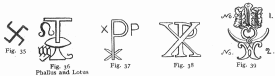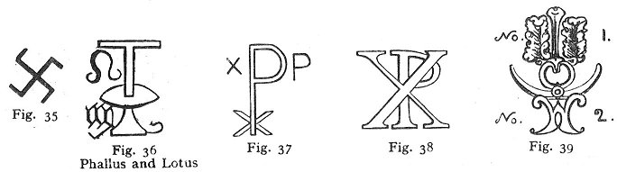 CHAPTER THE TWENTY-FIRST: THE ROSY CROSS IN INDIAN, EGYPTIAN, GREEK, ROMAN, AND MEDIÆVAL MONUMENTS THOUGH fire is an element in which everything inheres, and of which it is the life, still, according to the abstruse and unexplained ideas of the Rosicrucians, it is itself another element, in a second non-terrestrial element, or inner, non-physical; ethereal fire, in which the first coarse fire, so to speak, flickers, waves, brandishes, and spreads, floating (like a liquid) now here, now there. The first is the natural, material, gross fire, with which we are familiar, contained in a celestial, unparticled, and surrounding medium (or celestial fire), which is its matrix, and of which, in this human body, we can know nothing. In 1867, in Paris, a suggestive philosophical book was published, under the title of Hébreu Primitif; Formation des Lettres, ou Chiffres, Signes du Zodiaque et Racines Hébraiques, avec leurs Dérivés dans les Langues de l’Orient et de l’Europe, par Ad. Lethierry-Barrois. Ptha is the emblem of the Eternal Spirit from which everything is created. The Egyptians represented it as a pure ethereal fire which burns for ever, whose radiance is raised far above the planets and stars. In early ages the Egyptians worshipped this highest being under the name of Athor. He was the lord of the universe. The Greeks transformed Athor into Venus, who was looked upon by them in the same light as Athor (Apuleius, Cicero, Ovid; Ptolemæus, in tetrabibla; Proclus; Ennemoser, vol. i. p. 268, trans. by Howitt). Among the Egyptians, Athor also signified the night (Hesiod; Orpheus). 'According to the Egyptians', says Jablonski, 'matter has always been connected with the mind. The Egyptian priests also maintained that the gods appeared to man, and that spirits communicated with the human race.' 'The souls of men are, according to the oldest Egyptian doctrine, formed of ether, and at death return again to it.' The alchemists were a physical branch of the Rosicrucians. The more celebrated authors (and authorities) upon the art and mystery of alchemy are Hermes (whose seven chapters and 'smaragdine table', as it is called, contain the whole alchemical system); Geber, the 'Turba', 'Rosary', Theatrum Chemicum, Bibliothèque Hermétique, Chymical Cabinet; Artephius, Arnoldus de Villa Nova, Raimondus Lullius, Trevisan, Nicholas Flamel, Zachareus, Basilius Valentinus, Cosmopolita, and Philalethes (Thomas Vaughan). Refer also to The Hermetical Triumph, or the Victorious Philosopher's Stone: London, 1723; Lucas’s Travels, p. 79; Count Bernard of Treviso. Two leading works, however, on the hermetic subject are La Chiave del Gabinetto [1], Col. 1681, 12mo, by Joseph Francis Borri, an Italian; and Le Compte de Gabalis, ou Entretiens sur les Sciences Secrètes; imprimée à Paris, par Claude Barbin, 1671, 12mo, pp. 150. This book is the work of the Abbé de Villars, or is supposed to be so. J. V. Andrea, a writer upon hermetic subjects, was Almoner to the Duke of Wurtemberg, and wrote early in the seventeenth century. The Emperor Rudolphus the Second greatly encouraged learned men who had made acquaintance with alchemical lore. At the supposed revival of Rosicrucianism -in Paris, in March 1623, the Brethren were said to number thirty-six; of whom there were six in Paris, six in Italy, six in Spain, twelve in Germany, four in Sweden, and two in Switzerland. In 1616, the famous English Rosicrucian, Robertus de Fluctibus (Robert Fludd), published his defence of the society, under the title Apologia Compendiaria, Fraternitatem de Rosea-Cruce, Suspicionis et Infamiæ maculis aspersam abluens, published in 1616 at Frankfort. Since this time, there has been no authentic account of the Rosicrucians. We are now the first translators of Robert Fludd. 'Amongst an innumerable multitude of images and symbolical figures, with which the walls'--i.e. those of the caverns of initiation at Salsette--'are covered, the Linga or Phallus was everywhere conspicuous, often alone, sometimes united with the petal and calyx of the lotus, the point within the circle, and the intersection of two equilateral triangles' (Dr. Oliver, History of Initiation. See also Maurice on the Indian Initiations). The Linga, or pillar, or stone of memorial, in its material form, is the perpetuation of the idea of the male generative principle, as the physical means, in conjunction with the Yoni (Ioni), or discus, of the production of all visible things. In this connexion, the addition to the name of Simon Peter (Petra, or Pietra, Cephas, Jonas, Bar-Jonas, Ionas) will be recalled as suggestive. There is a sacred stone in every Temple in India. The Stone, or Pillar, or 'Pillow', of Jacob was sacred among the Jews. It was anointed with oil. There was a sacred stone among the Greeks at Delphi, which was also anointed with oil in the mystic ceremonies. The stone of Caaba, or black stone at Mecca, is stated to have been there long before the time of Mohammed. It was preserved by him when he destroyed the dove and images. The obelisks at Rome were, and are, Lingas (or Linghas). In the Temple of Jerusalem, and in the Cathedral of Chartres, they are in vaults. They are the idea of the abstract membrum, or 'affluence', or MEANS. To the initiated mind they imply glory, not grossness. Figs. 25-26 are the Crux Ansata of the Egyptians. This emblem is also found in India. According to Ruffinus and Sozomen, it imports the 'time that is to come'. It is a magical symbol. Fig. 27 is the imperial mound, and cross-sigma surmounting it. Figs. 28-29 are symbols of Venus (Aphrodite), the deity of the Syrians and Phœnicians. They are phallic emblems. Fig. 30 is the Phallus proper. It is the sigma of Zeus, Mithras, 'Baalim', Bacchus. Figures numbered 31, 'Osiris': these various figures signify also Jupiter-Ammon. The rectangular marks denote the Scandinavian Tuisco, Thoth (Mercurius, or Hermes). Fig. 35 is the Indian form of the same idea. The figure marked 36 is to be