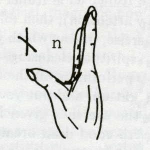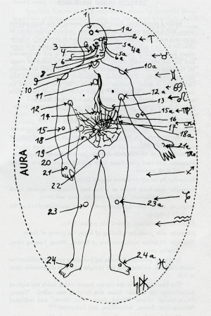 2: Forehead centers (receiving-influence) 3 and 3a: Inner ear centers (clairaudience) 4 and 4a: Parotid glands 5 and 5a: Tear ducts 6 and 6a: Eyes, receiving and sending centers (clairvoyance) 7: Chin centers and lingual gland 8: Submaxillary gland 9: Thyroid gland 10 and 10a: Shoulder centers, sebaceous glands 11: Thymus gland 12 and 12a: Sweat glands 13: Cardiac sympathetic nerve 14: Sympathetic nervous system 15 and 15a: Elbow and inner arm centers (receiving) 16: Spleen 17: Pancreas 18 and 18a: Hip centers 19: Solar plexus 20: Navel (sending and receiving center) 21 and 21a: Hand centers 22: Sexual organs (polar centers, receiving, discharge) 23 and 23a: Knee and inner leg centers 24 and 24a: Foot centers (discharge) On the outer right side the astrological signs are indicated. The arrows going out from these signs point to the part of the body ruled by each sign. The dotted oval around the drawing indicates the aura, the psychic cloak. Additionally, I will mention that a great part of the development of higher powers and magical abilities depends on the heart and kidneys (adrenal glands). The well-known proverb: "To try someone by heart and kidneys" [Jemand auf Herz und Nieren prufen], meaning "to test someone through and through" comes from this.