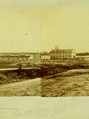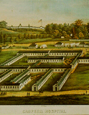 Figure 7. Formerly the barracks for the 1st Rhode Island Cavalry, Finley Hospital was a veritable "town, of wounds, sickness, and death." Courtesy of the National Library of Medicine.