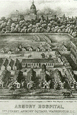 Figure 11. Located near the Seventh Street steamboat landing and the Washington and Alexandria Railroad station, Armory Square took the most severly injured—and suffered the highest death rate of any area facility. Courtesy of the National Library of Medicine. The hospitals encompassed all manner of public and private accommodations. The very first military hospital in Washington—located in two separate buildings on C Street between 3rd and 4 1/2 streets—was opened in February 1861 for Army Regulars. After the war's outbreak in April, Georgetown's Union Hotel and the City Infirmary on E Street were commandeered for the military's medical needs. Schools used as infirmaries included the Columbian and Georgetown Colleges, the Fifth Street Schoolhouse, and Miss Lydia English's Female Seminary, which still stands on the northeast corner of 30th and N streets, N.W. Mansion hospitals appeared on the country estates of former Washington Mayor Joseph Gales, Jr., at Eckington off North Capitol Street, and Dr. William J. Stone, on Meridian Hill near 14th Street. [12]