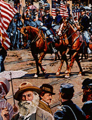 Figure 24. Illustration of the Grand Review of Union Troops, May 23–24, 1865, looking down Pennsylvania Avenue toward the Capitol. "For two days now," Whitman wrote on May 24, "the broad spaces of Pennsylvania avenue have been alive with a magnificent sight, the returning armies." Courtesy of the National Archives.