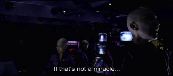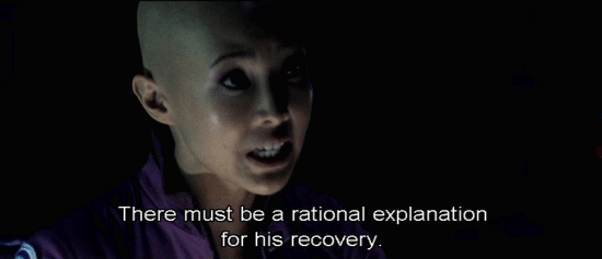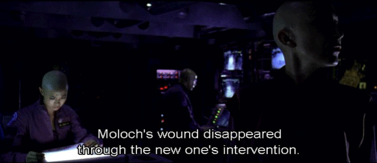 [Persephone] He was in his death throes. Now look at his heartbeat. If that's not a miracle ... [Elisa] Ridiculous. It was just a superficial wound. [Persephone] Moloch's wound disappeared through the new one's intervention. [Elisa] There must be a rational explanation for his recovery.