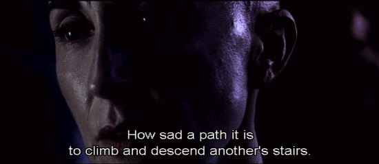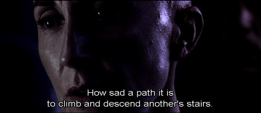 [Persephone] It was al planned in advance. [Charon] Get out. I'm doing it for your good. [Persephone] How sad a path it is to climb and descend another's stairs. [Charon] What does that mean?