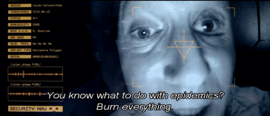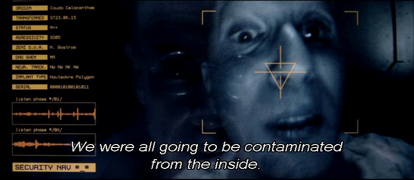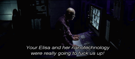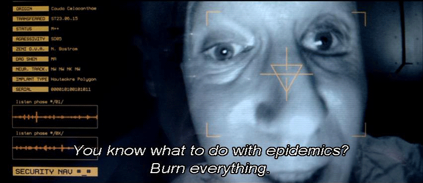and burning up in hell like the damned that we are! [Charon] That's nonsense. [Attila] I know what you're playing at, Charon. I cracked your files a long time ago. Your Elisa and her nanotechnology were really going to fuck us up! We were all going to be contaminated from the inside. Infected like a common computer program. You know what to do with epidemics? Burn everything.
