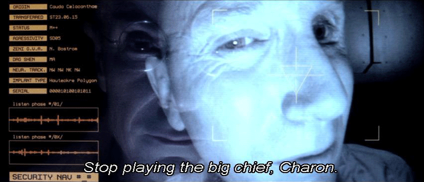 [Attila] I'm working on it, sweetie. Keep your hair on. [Charon] That will do. Remember, you're only a prisoner. [Attila] Stop playing the big chief, Charon. [Charon] I could withdraw your account to the network. [Attila] You wouldn't do that. You need me. And if they found out up there,