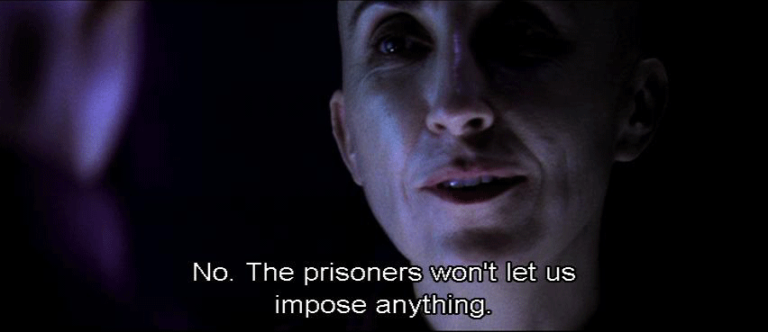 [Elisa] Never lose sight of them. [Persephone] That's nothing. Par for the course. When Caesar intervenes, they calm down quickly. [Elisa] Did you put him in charge? [Persephone] No. The prisoners won't let us impose anything. They organize themselves.