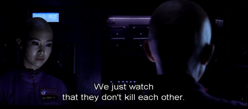 We just watch that they don't kill each other. Sometimes we intervene too late, unfortunately. [Elisa] Maybe if you applied the protocols more strictly. [Persephone] There's more to life than protocols.