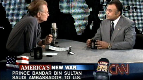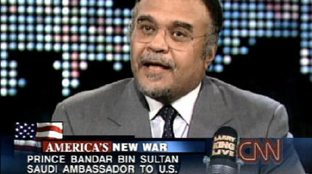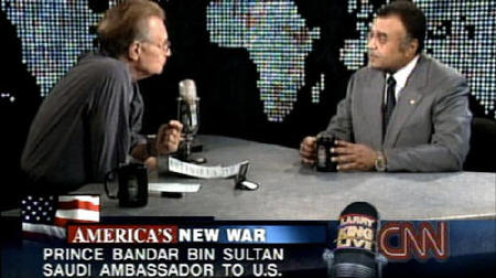 [Witchburners] Burn him! Burn him! [Larry King] Prince Bandar, do you know the bin Laden family? [Prince Bandar] I do, every well. [Larry King] What are they like? [Prince Bandar] They're really lovely human beings. He is the only one I never, I don't know him well, but I met him only once. [Larry King] What was the circumstance under which you met him? [Prince Bander] This is ironic.