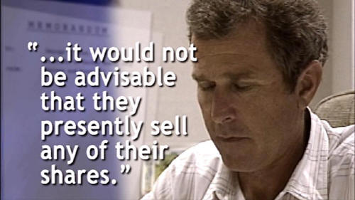 [George Bush] [August 1992] When you're the president's son and you've got unlimited access combined with some credentials from a prior campaign, in Washington, D.C., people tend to respect that. I mean, access is power. And I can find my dad and talk to him any time of the day. [Moore] Yes, it helps to be the president's son, especially when you're being investigated by the Securities and Exchange Commission. [TV News] In 1990, when Mr. Bush was a director of Harken Energy, he received this memo from company lawyers warning directors not to sell stock if they had unfavorable information about the company.