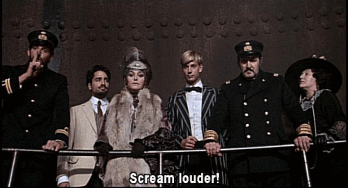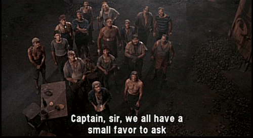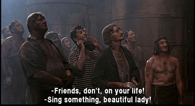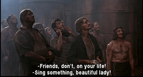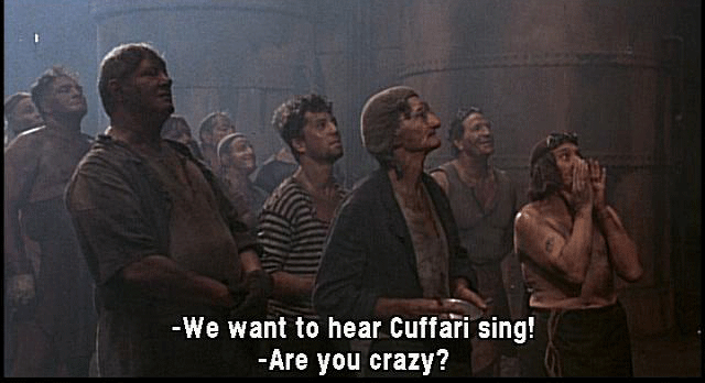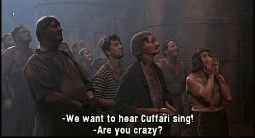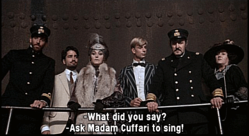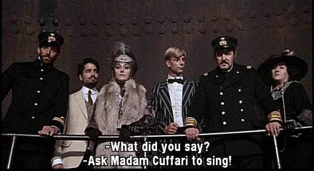 Captain, sir, we all have a small favor to ask. What did you say? Ask Madam Cuffari to sing! Scream louder! We want to hear Cuffari sing! Are you crazy? This is a crazy request! Friends, don't, on your life! Sing something, beautiful lady! |
