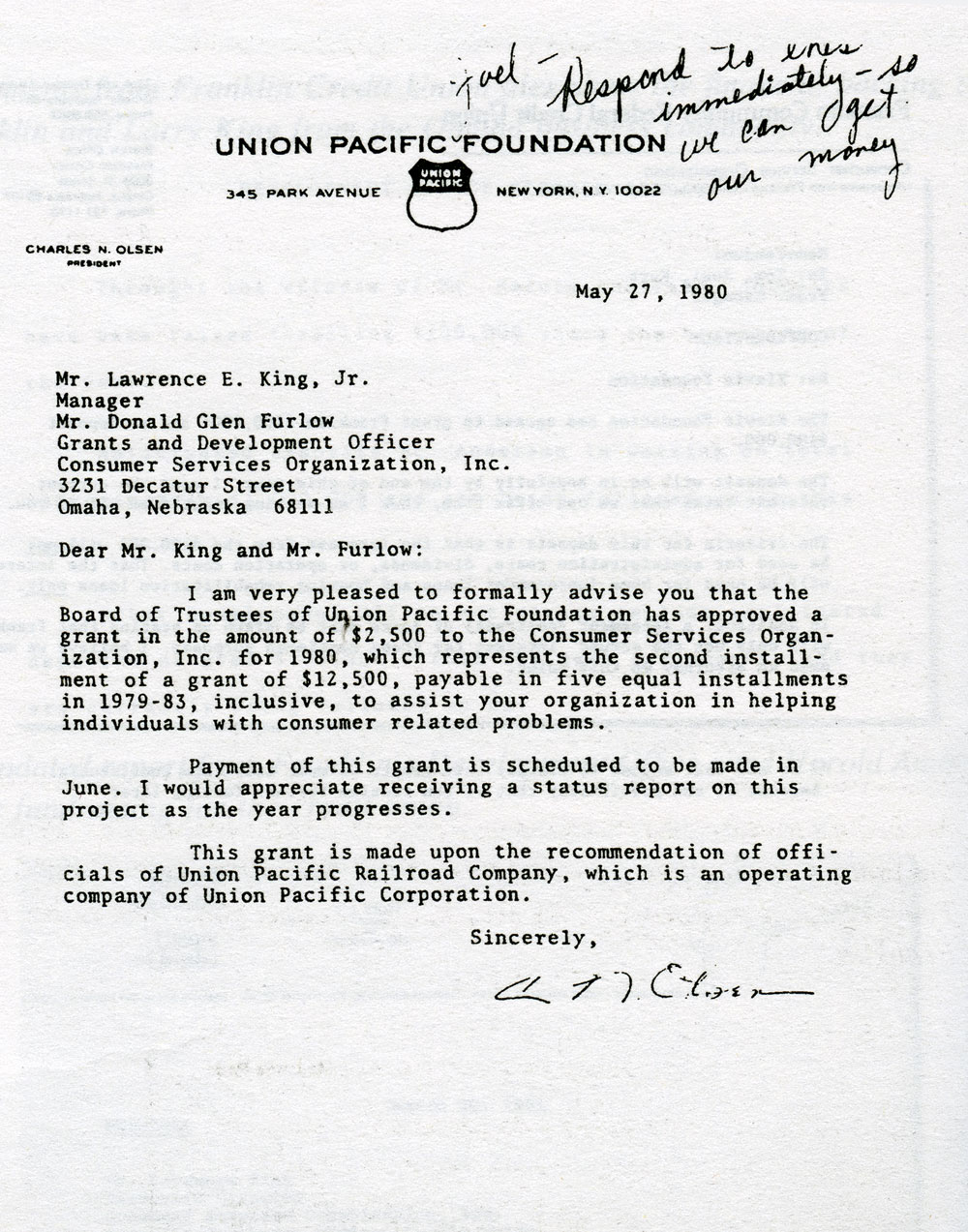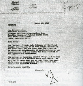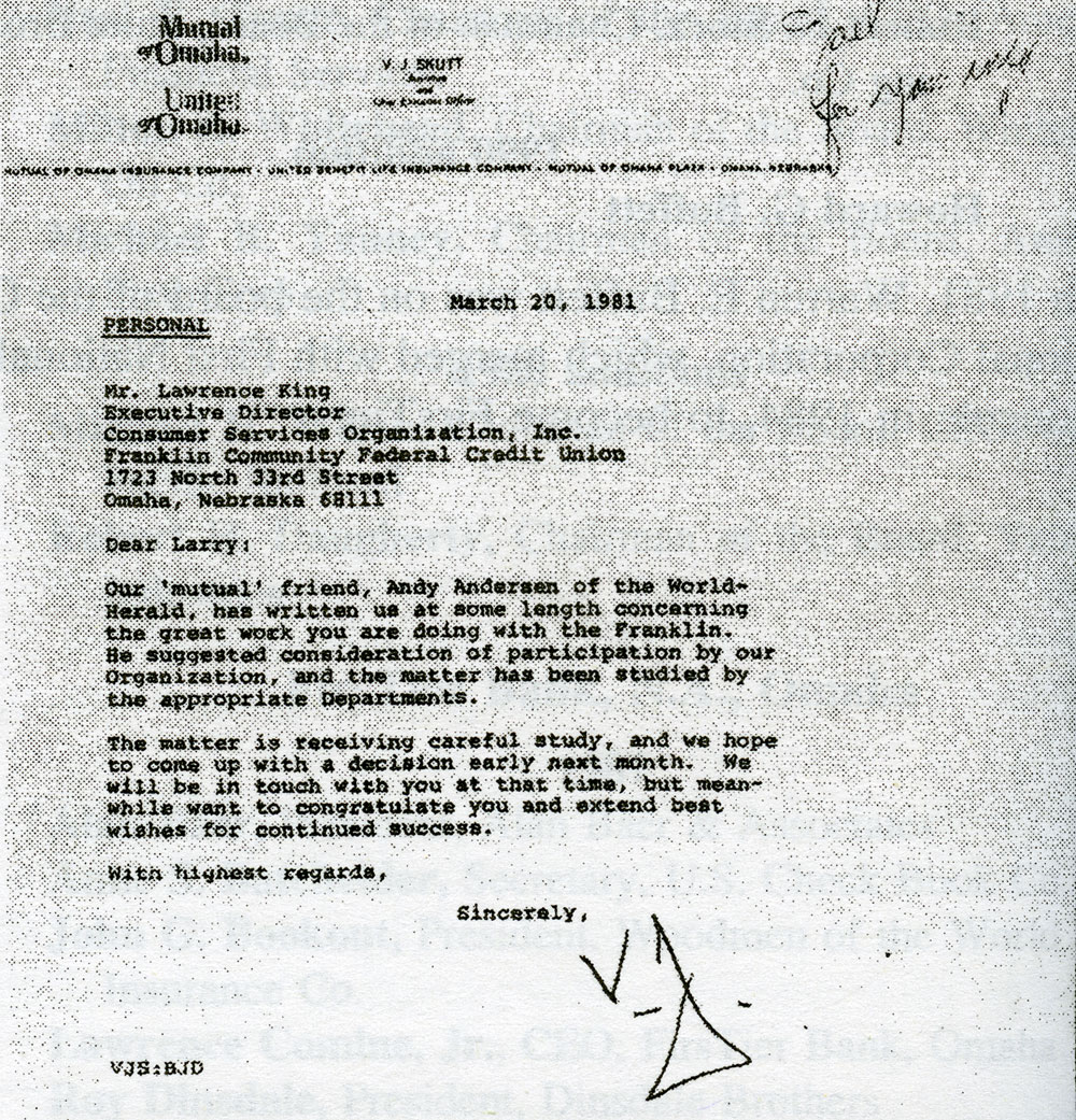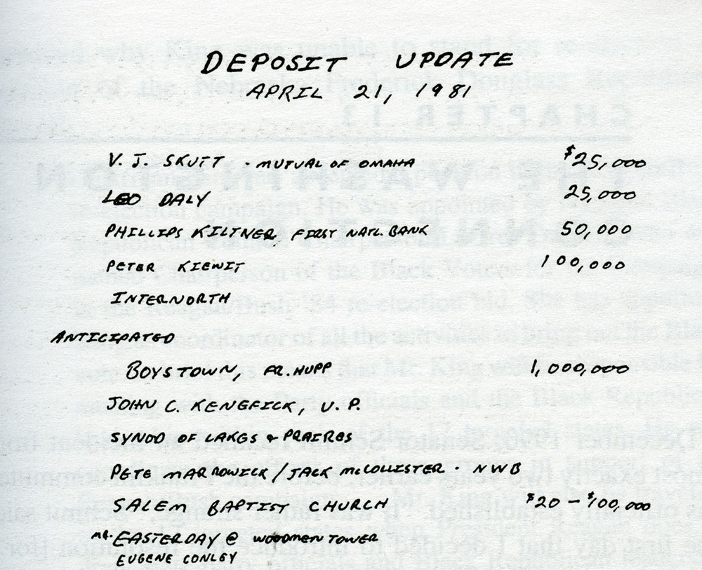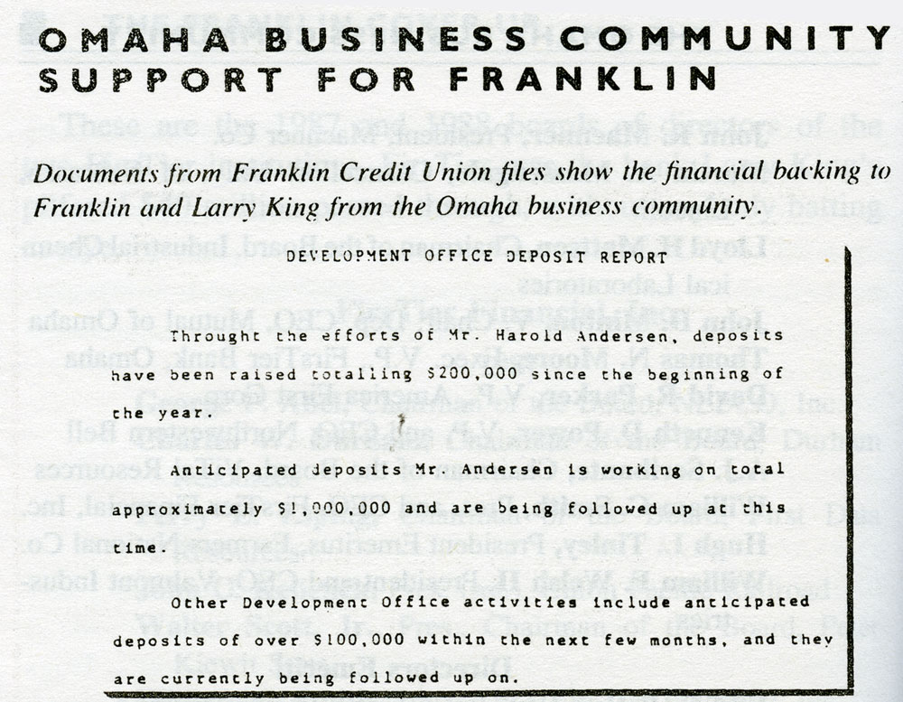Edd H. Bailey, Pres. (ret.), Union Pacific Railroad 1990 addition Howard G. Buffett In 1981, Warren E. Buffett was on the board of the Omaha National Corporation, which merged with First National Bank of Lincoln in 1984, to become FirsTier. An undated report from Franklin's Development Office cited Harold Andersen's fundraising for the credit union. A letter to Larry King from V./ J. Skutt, then chairman and CEO of Mutual of Omaha, referred to lobbying for Franklin by Harold "Andy" Andersen. Larry King wrote this memo to his staff about funds forthcoming from the Kiewit Foundation, associated with the Peter Kiewit and Sons construction firm. In 1980, the Union Pacific Foundation informed Larry King of its latest grant. A handwritten note at the top instructs a Franklin employee to expedite the transaction. According to this 1981 memo from Franklin Credit Union files, Boys Town, the famous orphanage,. planned to deposit $1 million with Franklin. Boys Town officials maintained that they had no connections with Larry King or Franklin. Memorandum of a phone call to Joel Rogers, Franklin staffer and a homosexual lover of King, from a Boys Town official.