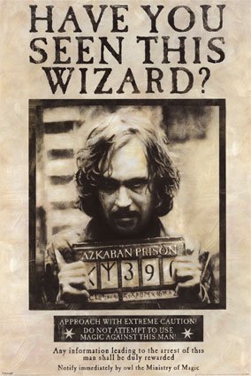 by Wikipedia Sirius Black is a fictional character in J. K. Rowling's Harry Potter series of novels. As an adult, he is played in the film adaptations by Gary Oldman, and as a teenager by James Walters. Gary Oldman as Sirius Black in Harry Potter and the Prisoner of Azkaban. Biography Sirius Black (c.1958-June 1996) was first mentioned briefly in Harry Potter and the Philosopher's Stone as a wizard who lent Hagrid a flying motorbike shortly after Lord Voldemort killed James and Lily Potter. His character becomes prominent in Harry Potter and the Prisoner of Azkaban, in which he is the eponymous prisoner. Family and friends At the time of the Harry Potter story, Sirius is the last scion of the House of Black. His parents, Orion Black and Walburga Black, were second cousins and both were Blacks by birth. The name "Sirius" appears to be a traditional name in the Black family, recurring in at least three of its several generations. This is related to the tradition of having family members named after stars or constellations. The names Cygnus, Arcturus and Regulus have also occurred at least twice each. Sirius has two maternal uncles, Alphard Black and Cygnus Black, and one paternal aunt, Lucretia (Black) Prewett. Cygnus' wife Druella (Rosier) Black is his aunt by marriage, and Lucretia's husband Ignatius Prewett is his uncle by marriage. His younger brother is Regulus Black, and he also has three older cousins, Bellatrix (Black) Lestrange (who later murders Sirius), Andromeda (Black) Tonks (his favourite cousin and the mother of Nymphadora Tonks), and Narcissa (Black) Malfoy. Narcissa and Bellatrix were praised by the Blacks for marrying into "respectable" pureblood families, while Andromeda was disowned for marrying Ted Tonks, a Muggle-born wizard. Sirius's younger brother, Regulus, was also praised for joining Lord Voldemort's organisation, the Death Eaters. Sirius and Andromeda were anomalies in the Black clan, and - like their uncle Alphard - were removed from the official family tree for being "blood traitors". Sirius was considerably ashamed of his family, and knew nothing but unhappiness at home. It is unknown whether he was always rebellious against his family and their traditions or if he was changed by his experiences at Hogwarts. Sirius was best friends with James Potter, Harry's father (who might have been related to Sirius through the marriage of Charlus Potter to Dorea Black, a great-aunt of Sirius'), and was also friends with Remus Lupin and Peter Pettigrew. When the group discovered that Lupin was a werewolf, they studied secretly to become Animagi in solidarity with Lupin, to keep him company during his transformations. (Lupin was not compelled to attack non-humans when transformed.) Sirius's Animagus form was a large black dog, earning him the nickname "Padfoot". Sirius is shown to have been very handsome in his Hogwarts days, when James & Sirius were said to be inseparable and were very popular and, additionally, they had a reputation for being practical jokers. Sirius also shared James' intense dislike of Severus Snape - as Professor Quirrel said of Snape and James, "they loathed each other" - and in one of Snape's memories Sirius and James were shown bullying Snape in their fifth year. In defence of their apparent bullying, Sirius insisted that even as a teenager Snape had a mean streak and was not the "innocent victim" his memories would make him out to be, although what caused the intense rivalry is unknown. It is generally believed that the antagonism stemmed from James hatred of the Dark Arts and his hatred of those who felt that being "pure bloods" made them better than those who were only "half blood" or of pure muggle background, and unto that hated those of "lesser blood", a feeling that Sirius shared. Despite their arrogance, Sirius and James did not believe in discriminating or persecuting people based on their "blood" origin. Sirius's family sympathised with Lord Voldemort's desires to "cleanse" the Wizarding world of non-purebloods, and his younger brother Regulus joined the Death Eaters. At the age of sixteen, Sirius ran away from home to live with the Potter family (who might have been relatives of the Blacks by marriage), disgracing his family and prompting the removal of his name from the Black family tree tapestry (a fate shared by any Black family member his parents didn't like). Alphard Black, Walburga's brother, sympathised with his young nephew and left him a great deal of money. Walburga then removed Alphard's name from the official family tree. When James married Lily Evans, Sirius was his best man at the wedding and later became Harry's godfather. imprisonment and escape When the Potters went into hiding from Voldemort, they intended to make Sirius their Secret-Keeper. At the last minute Sirius convinced them to appoint Pettigrew to the task instead, under the assumption no one would predict such a move. Instead of keeping the secret, Pettigrew betrayed the Potters to Voldemort. When confronted by Sirius, Pettigrew produced an explosion to fake his own death, leaving behind only a finger, which he had severed himself, as "evidence" of his "death". The same explosion killed twelve nearby Muggle bystanders, and Sirius was left framed for the "murder" of Pettigrew and the bystanders, and betrayal of the Potters. In light of the overwhelming evidence against him, his guilt was so completely assumed by the ruthless Barty Crouch, that Sirius was sent straight to Azkaban without trial. He was imprisoned there in solitary confinement for twelve years, under relentless mental torture at the hands of the Azkaban guards, the dementors. Wanted poster that appeared following the escape of Black. During the course of events described in Harry Potter and the Prisoner of Azkaban, Sirius escaped from Azkaban after learning that Pettigrew was still alive and at large. His escape led to a massive manhunt, one of the largest ever in the wizarding world; and even the 