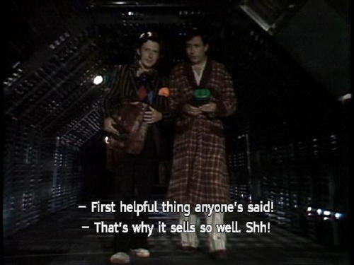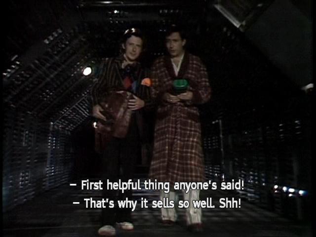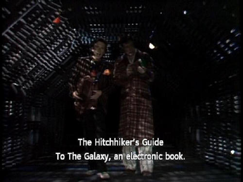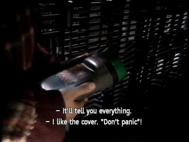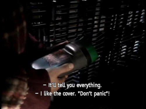 [Ford] The Hitchhiker's Guide to the Galaxy, an electronic book. [Ford] It'll tell you everything. [Arthur] I like the cover. "Don't panic"! [Arthur] First helpful thing anyone's said! [Ford] That's why it sells so well. Shh! |