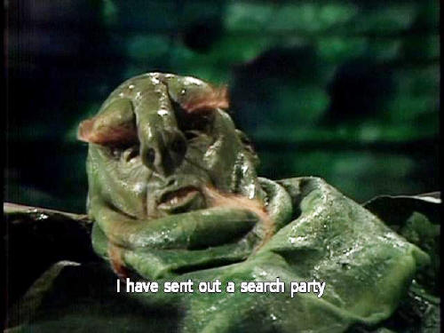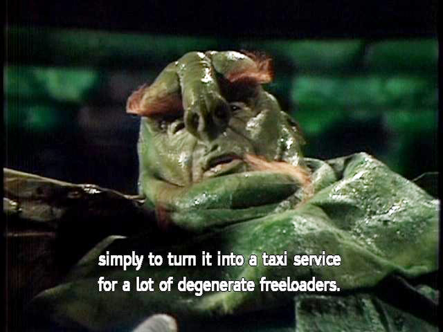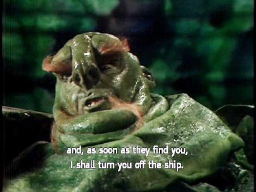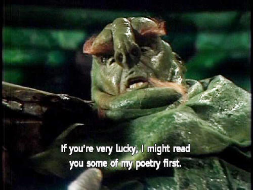 [Vogon Captain] simply to turn it into a taxi service for a lot of degenerate freeloaders. [I have sent out a search party [Vogon Captain] and, as soon as they find you, I shall turn you off the ship. [Vogon Captain] If you're very lucky, I might read you some of my poetry first. |