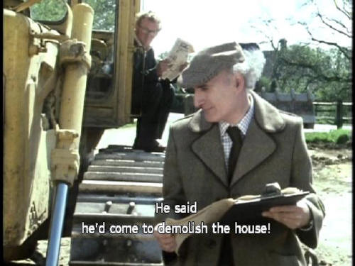 [Arthur] Appropriate time?! [Arthur] The first I heard about it was when a workman arrived yesterday. [Arthur] I thought he'd come to clean the windows. [Arthur] He said he'd come to demolish the house! |