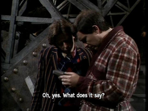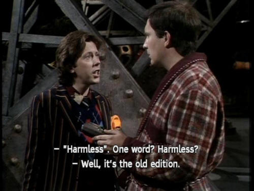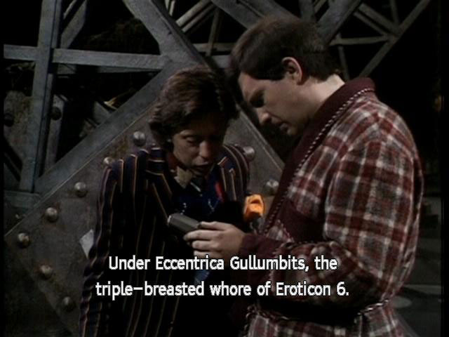 [Ford] Under Eccentrica Gallumbits, the triple-breasted whore of Eroticon 6. [Arthur] Oh, yes. What does it say? [Arthur] "Harmless." One word? Harmless? [Ford] Well, it's the old edition. |