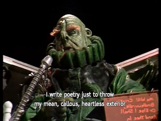 [Vogon Captain] No! You're completely wrong. [Vogon Captain] I write poetry just to throw my mean, callous, heartless exterior into sharp relief. I'm going to throw you off the ship anyway. Guard! Take the prisoners to number 3 airlock and throw them out. |