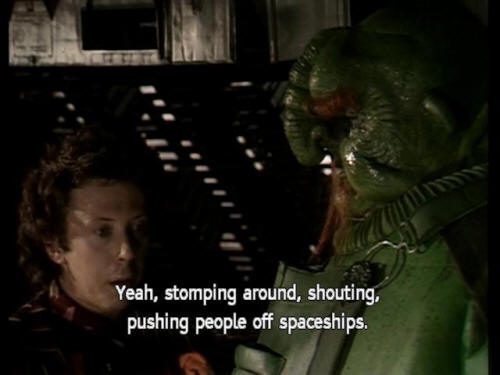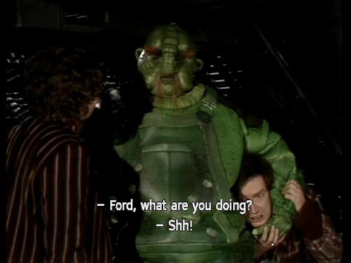 [Ford] Yeah, stomping around, shouting, pushing people off spaceships. [Vogon Guard] Well, the hours are good. [Ford] They'd have to be (!) [Arthur] Ford, what are you doing? [Ford] Shh! |