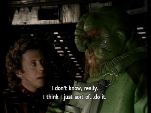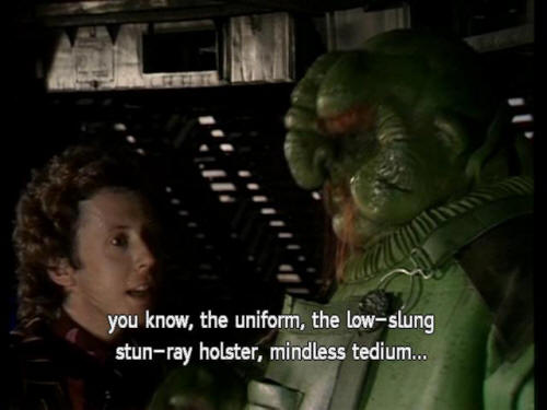 [Ford] The rubber? The machismo? [Vogon Guard] I don't know, really. I think I just sort of ... do it. [Vogon Guard] My aunt said that spaceship guard was a good career for a young Vogon -- [Ford] you know, the uniform, the low-slung stun-ray holster, mindless tedium ... |