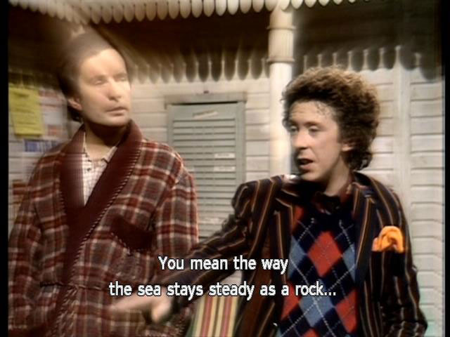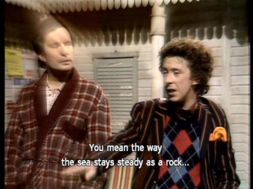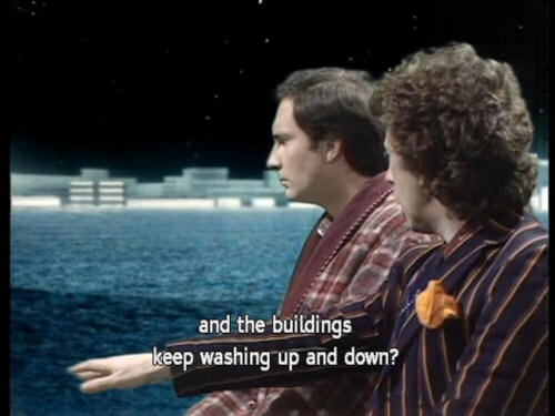 [Ford] Sea ... [Arthur] You know, if this is Southend, there's something very odd about it. [Ford] You mean the way the sea stays steady as a rock ... [Ford] and the buildings keep washing up and down? [Ford] I thought that was odd. |