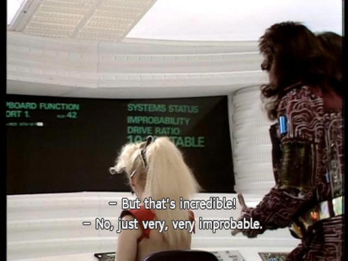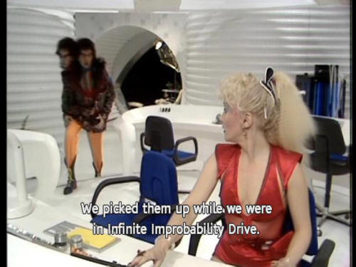 (BLEEPING) [Trillian] We picked them up while we were in Infinite Improbability Drive. [Zaphod] But that's icnredible! [Trillian] No, just very, very improbable. [Trillian] Don't worry about the aliens. Just a couple of guys, I expect. |