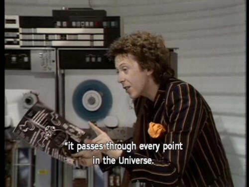 [Ford] Ah, this is what I was after! [Ford] "Sensational new breakthrough in improbability physics. [Ford] "As the ship's drive reaches Infinite Improbability, "it passes through every point in the Universe. |