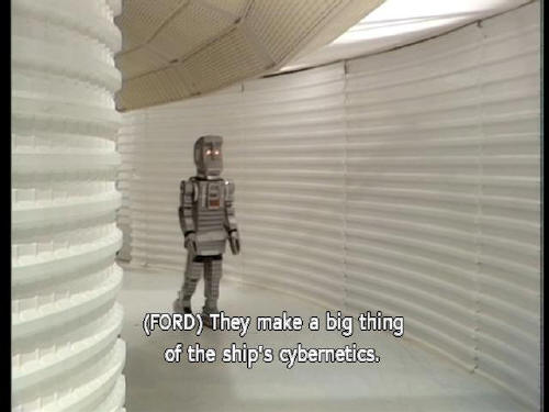 [Ford] They make a big thing of the ship's cybernetics. [Ford] "A new generation of Sirius Cybernetics Corporation computers [Ford] "and robots with the new GPP feature." [Arthur] GPP? What's that? |
