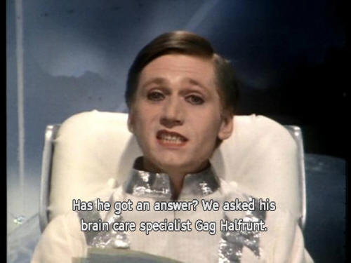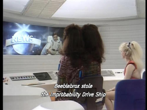 [Reporter] Has he got an answer? We asked his brain care specialist Gag Halfrunt. [Specialist] Well, Zaphod's just zis guy, you know ... [Reporter] Beeblebrox stole the Improbability Drive Ship [Reporter] when he was meant to be launching it ... |