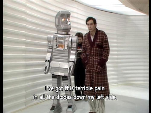 [Marvin] I've got this terrible pain in all the diodes down my left side. [Arthur] Really? [Marvin] Oh, yes. I mean, I've asked for them to be replaced, [Marvin] but no one ever listens. |