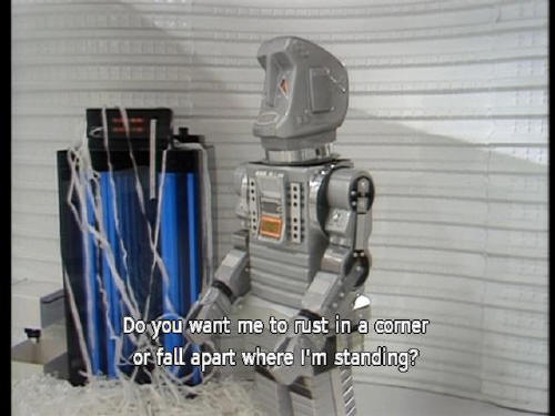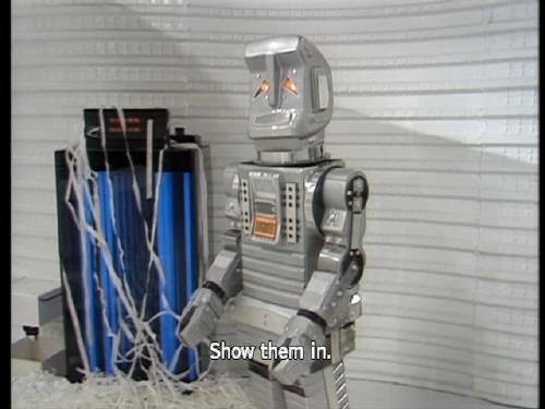 [Door] Glad to be of service. [Marvin] I suppose you'll want to see the aliens now. [Marvin] Do you want me to rust in a corner or fall apart where I'm standing? [Zaphod] Show them in. |