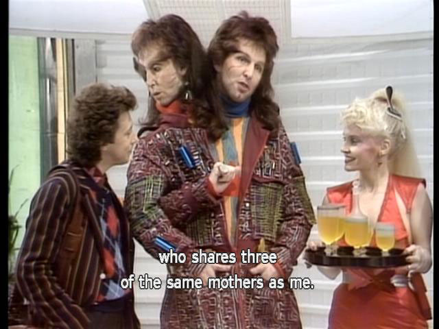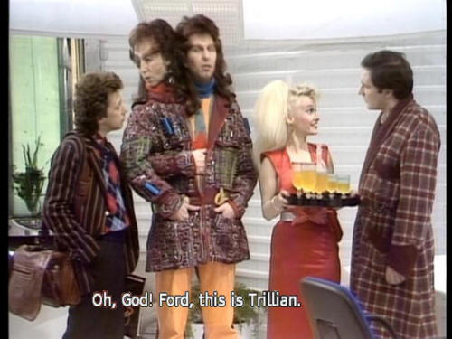 [Zaphod] Oh, God! Ford, this is Trillian. [Zaphod] Hi! Trillian, my semi-cousin, Ford, [Zaphod] who shares three of the same mothers as me. [Zaphod] Is this sort of thing going to happen every time we use the Drive? [Trillian] Very probably, I'm afraid. |