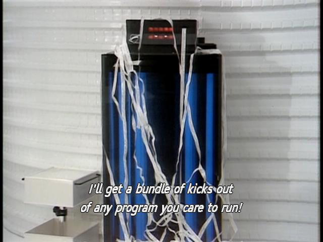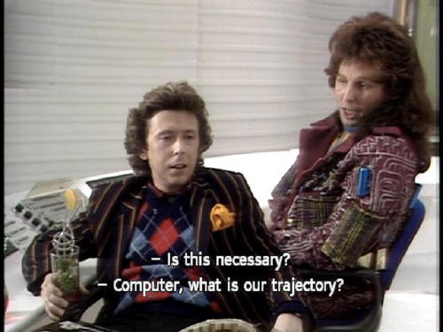 [Computer] I'll get a bundle of kicks out of any program you care to run! [Ford] Is this necessary? [Zaphod] Computer, what is our trajectory? [Computer] A real pleasure, fella! [Computer] We are currently in orbit at an altitude of 300 miles |