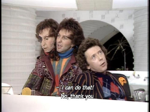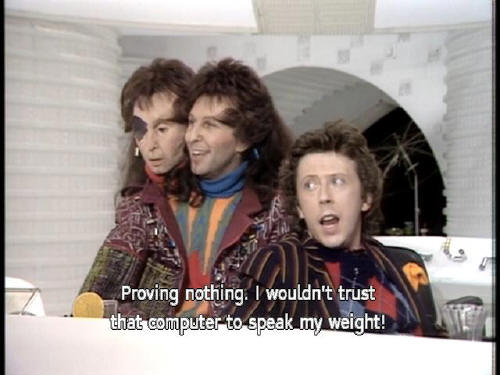 [Computer] around the legendary planet Magrathea. Golly! [Ford] Proving nothing. I wouldn't trust that computer to speak my weight! [Computer] I can do that! [Ford] No, thank you [Computer] I can work out your personality problems to ten decimal places. |