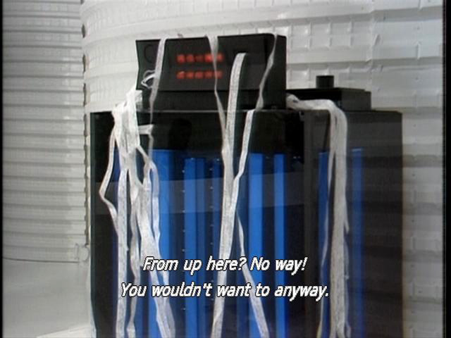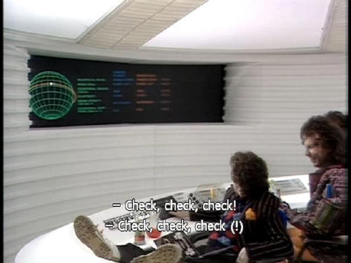 [Zaphod] Check, check, check! [Ford] Check, check, check (!) [Trillian] Can we see it at all, Computer? [Computer] Hi, there. [Trillian] Can we see it? [Computer] From up here? No way! You wouldn't want to anyway. |
