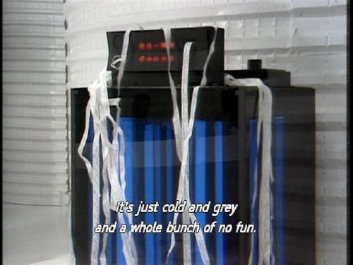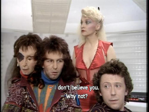 [Computer] It's just cold and grey and a whole bunch of no fun. [Trillian] Great! For this, I got my ears pierced! [Zaphod] With half the Empire's wealth stored on it, it can afford to look frumpy! [Ford] I don't believe you. [Zaphod] Why not? |