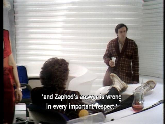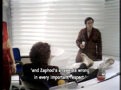 'and Zaphod's answer is wrong in every important respect.' [Arthur] Is it safe? [Zaphod] Of course! It's been dead for five million years. (FANFARE) |
