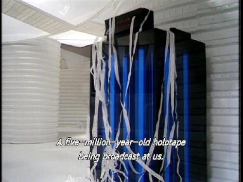 [Slartibartfast] Greetings to you. [Zaphod] Computer, what's this? [Computer] A five-million-year-old holotape being broadcast at us. [Slartibartfast] This is a recorded announcement |