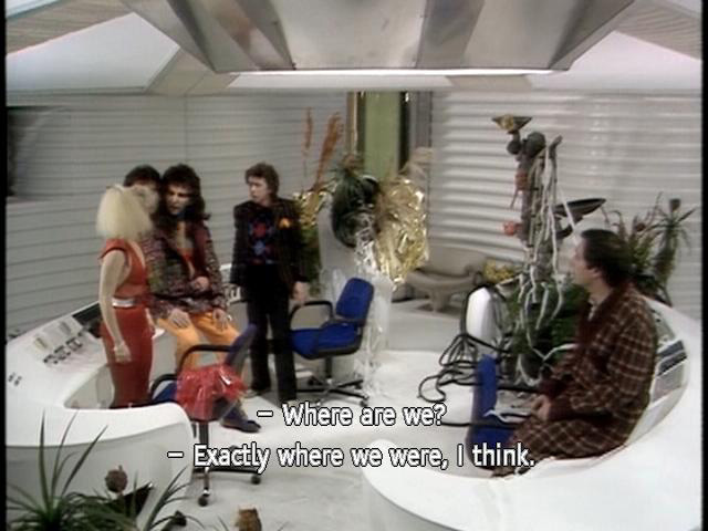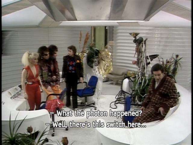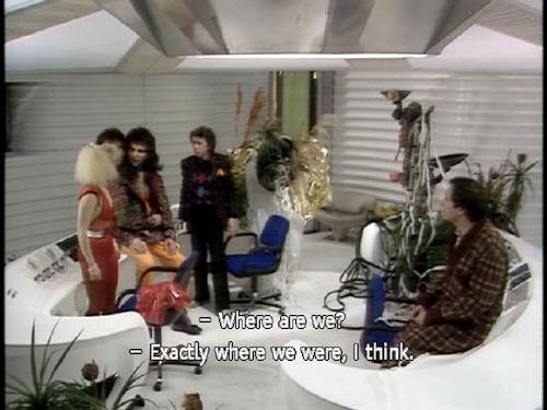 [Zaphod] What the photon happened? [Arthur] Well, there's this switch here ... [Zaphod] Where are we? [Trillian] Exactly where were were, I think. [Zaphod] What about the missiles? [Ford] Well, according to this, they have turned into a bowl of petunias |