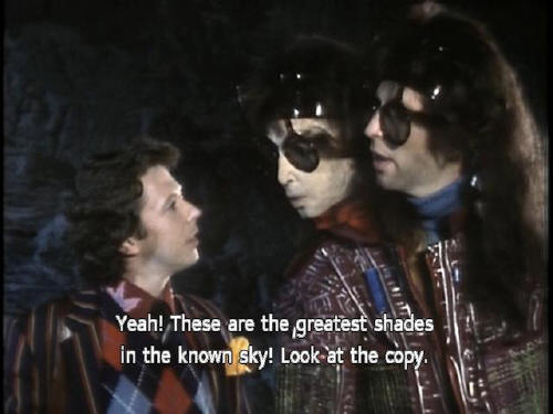 [Zaphod] Yeah! These are the greatest shades in the known sky! Look at the copy.