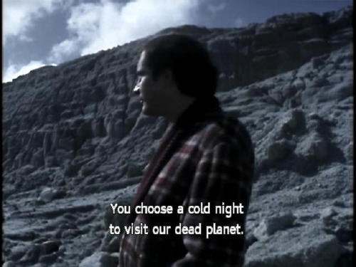 [Slartibartfast] You choose a cold night to visit our dead planet. [Arthur] Who are you? [Slartibartfast] My name is not important. [Arthur] You startled me. |